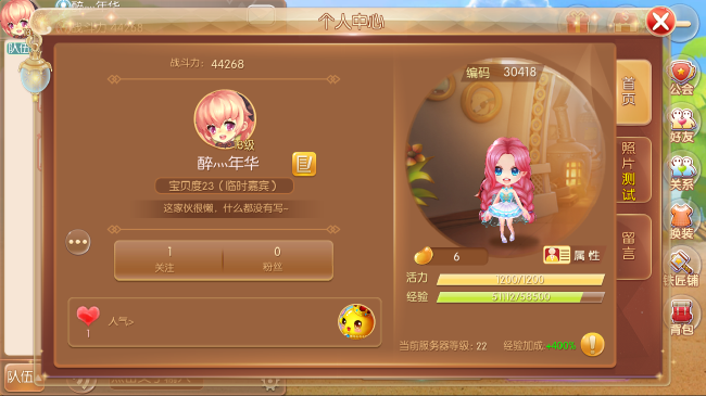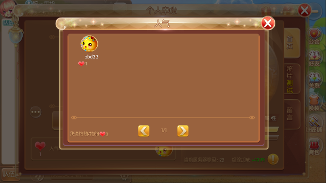 角色区域显示的是你游戏角色相关信息,比如角色形象、属性、经验等等。对了,小金豆也在这里显示,你可以将小金豆送给你喜欢的人、暗恋的人、偶像等等。每天对每一个人都有一次免费送小金豆的机会哦。