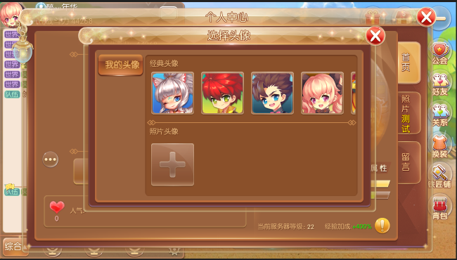社交区域从上到下分别有个人头像(可以用自己的生活照片哦)、所属公会和职位、个性签名、粉丝数量和关注数量、人气和最追捧你的人列表。点击头像会弹出如下头像选择框,选择你上传的照片或者系统默认的头像: