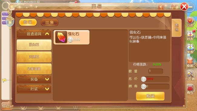 普通道具:可购买强化石,洗练石,改名卡,染色药水。其中,强化石和洗练石的价格会随着买入和卖出而变化。