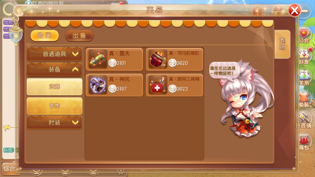 市场分为3大模块,分别是普通道具,装备,时装。交易中所有的物品,都只能用银币购买。